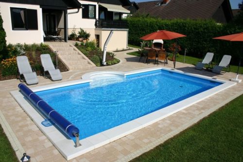 Das Rechteckbecken wird aus handlichen Styropor-Systembausteinen auf einer bauseits bereits vorhandenen Betonplatte aufgebaut und mit Beton ausgegossen.